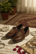 Handcrafted in rich brown with detailed crest embroidery, this Punjabi jutti is perfect for men who value tradition with style. A versatile pair to complement sherwanis, kurtas, or Indo-western outfits.