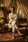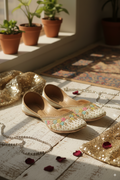 A striking golden Punjabi jutti decorated with blue peacock motifs. An artistic and festive choice for mehndi, sangeet, and cultural gatherings.