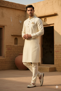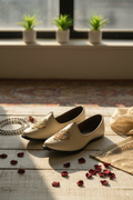 An ivory Punjabi jutti designed with golden regal embroidery motifs. A versatile piece that enhances both bridal and festive attire.