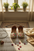 An ivory Punjabi jutti detailed with vibrant pink and green floral embroidery, highlighted with golden threadwork. A festive pick for weddings and celebrations.