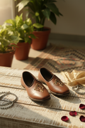 Sleek and sophisticated, this light brown Punjabi jutti showcases royal embroidery in golden tones. Lightweight and comfortable, it's perfect for festive occasions, weddings, or casual ethnic styling.
