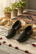 A modern twist on tradition, this matte black Punjabi jutti comes with subtle embroidered detailing. Versatile enough to pair with both western formals and ethnic wear, offering elegance with comfort.